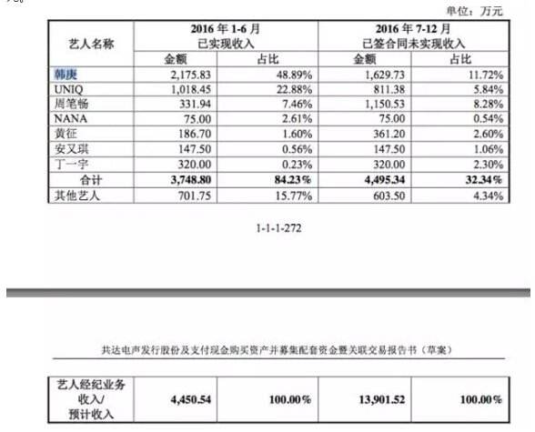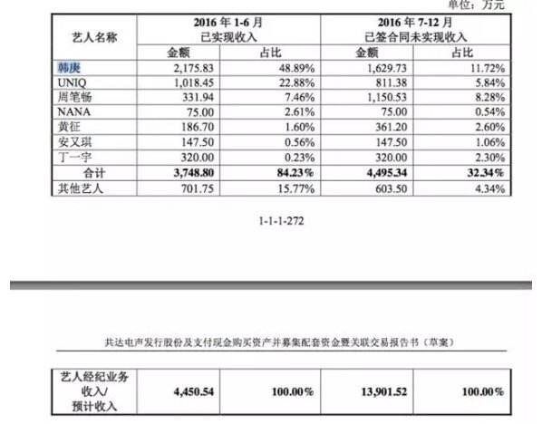 另外,韩庚也将从这次收购中获得5080万元。作为乐华文化旗下最赚钱的艺人,收购草案也披露了韩庚的“商业价值”:2016年可为公司带来3800万元的收入。