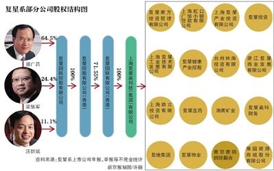 复星系旗下上市公司豫园股份11月9日发布的最新重组报告书显示,整个复星体系最顶层的名叫复星国际控股有限公司,郭广昌、梁信军、汪群斌为三位主要股东,其持股情况分别为64.5%、24.4%和11.1%。复星国际控股有限公司通过全资子公司复星控股有限公司持有复星国际(港股上市公司)71.76%股份,复星国际持有复星高科100%股份。