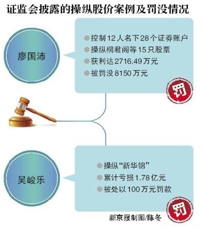 另外,佛山廖国沛利用28个账户,操纵桐君阁等15只股票,获利达2716.49万元,被罚没8150万元