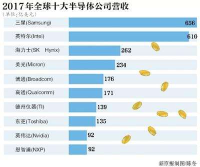 跳出通信行业,全球芯片市场上巨头更多。IC Insights报告显示,全球半导体市场规模达到了4385亿美元,前十大半导体厂商占据了整个市场58.5%的份额,这些厂商分别是三星、英特尔、SK海力士、Micron、博通、高通、德州仪器、Toshiba、英伟达和恩智浦,并没有出现中国厂商的身影。国内最大的半导体企业华为旗下海思半导体的2017年销售额约为61.6亿美元,而十大巨头中三星电子的销售额为656亿美元,最末的恩智浦半导体的销售额为92亿美元。