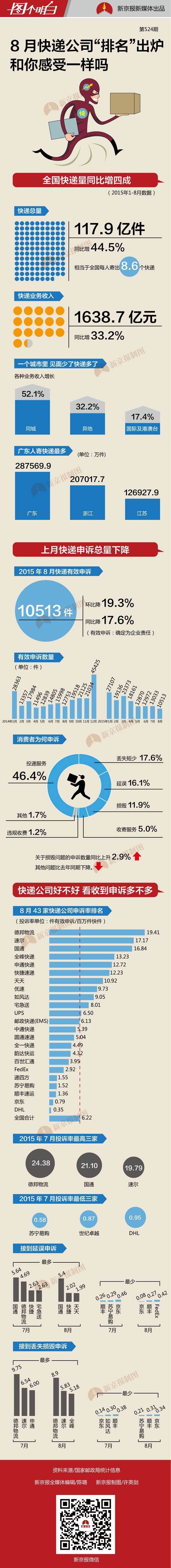 本周,国家邮政局公布的统计数据显示,8月全国快递业务共接到10513件有效投诉,平均每百万件快件中,有6.22个会接到消费者申诉。具体到43家接到申诉的快递企业,申诉率最高的是德邦物流和速尔,最低的是DHL和京东。对于这样的排名,和你平时的体验一致吗?(更多新闻,请关注新京报微信号:bjnews_xjb)
