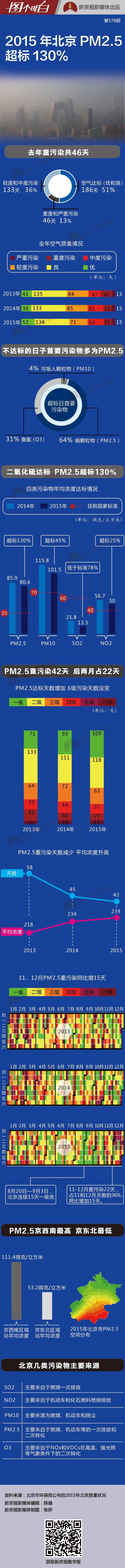 元旦后的第一个工作日,北京市环保局公布的2015年北京市空气质量状况。数据显示,去年北京空气质量达标的天数为186天,占全年总数的51%。但换个角度想,去年仍有49%的日子,北京空气有污染,其中重度污染31天,严重污染15天,两者累计起来有一个半月吧,比2014年同类天气多了1天。