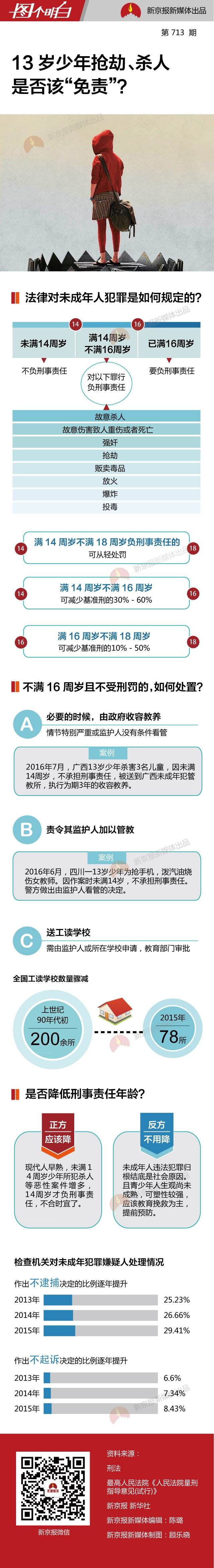 两个月前,为了抢一部苹果手机,他泼汽油烧伤一名女教师。女教师重度烧伤,但警察对他的处罚是,让其父亲严加看管。这样的决定,都因为他未满14岁,根据法律规定,不需要承担刑事责任。面对越来越多由未满14岁少年所犯的杀人、抢劫等恶性案件,有人质疑,成型于1979年的刑法所规定的刑事责任年龄已经“过时”。那么,引发争议的刑事责任年龄,目前法律是如何规定的?对未成年人犯罪, 是如何处置的?(更多新闻,请关注新京报微信公号:bjnews_xjb)
