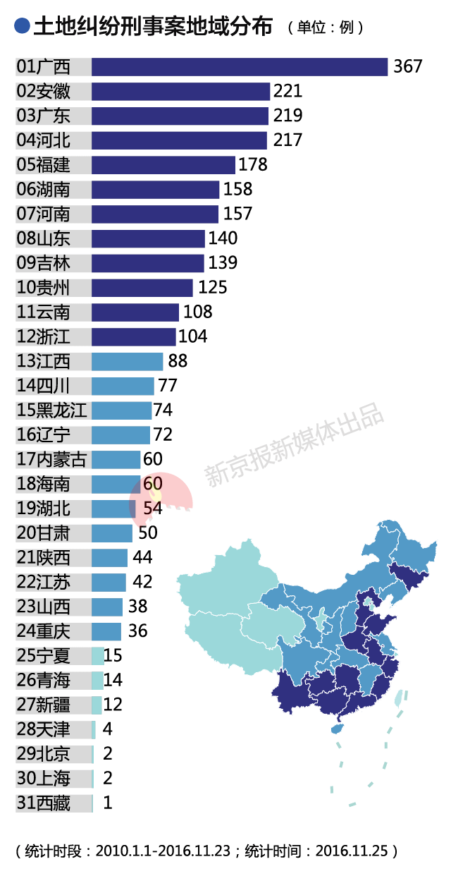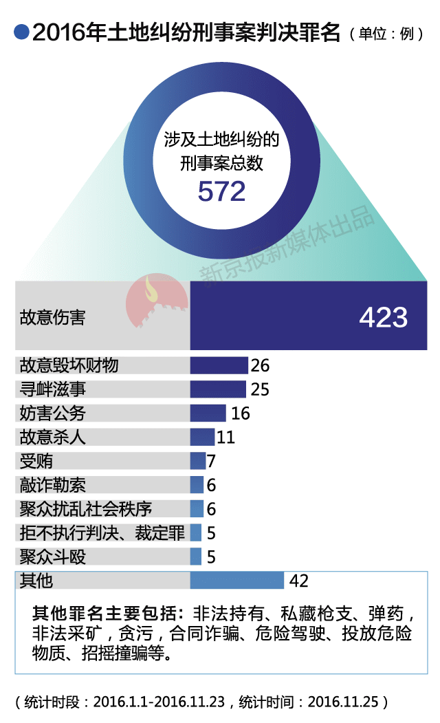 那么近些年,全国到底有多少因土地纠纷而起的刑事案件?哪里的案件更多?那些被告人都受到什么样的惩罚?这些问题,我们无法准确回答,但通过梳理相关判决,也许可以了解大致状况。(更多新闻,请关注新京报微信公号:bjnews_xjb)