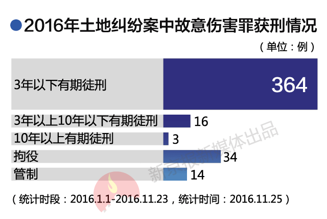 2016年以来的土地纠纷刑事案,绝大部分发生在乡镇、农村,当事人大多数是农民。村民之间因为耕地划界不清、有争议土地的归属等问题发生冲突,从吵架到大打出手,甚至闹出人命。从获刑情况看,被告人最终被判3年以下有期徒刑的是绝大多数。说明造成重伤等情节严重的情况还是少数。