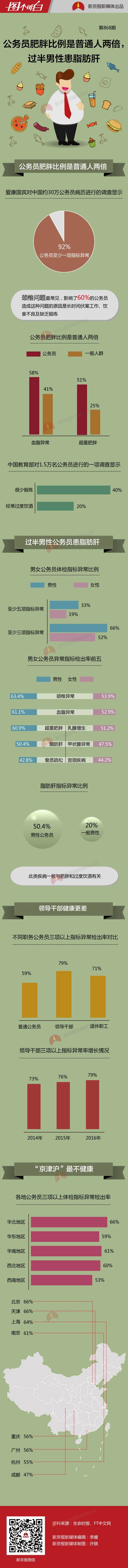 一项调查显示,中国公务员并没有一般人健康。近日,爱康国宾对30万份公务员常规体检结果的分析调查发现,在16类健康指标中,92%的公务员样本人群至少一项指标异常。