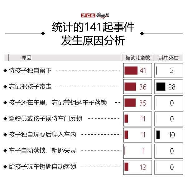 在这些儿童被困汽车事件中,事情发生的原因和后果有很大的差异。孩子被困车中主要分成三种类型,一是有意将孩子独自留在车中,有些监护人因为临时有事以为将孩子放在车中比较安全,但忘记了封闭车厢的危险性;另一类就是因为监护人疏忽,忘记把孩子带走或者孩子独自玩耍爬入车内发生意外;此外,还有因为忘带钥匙、误操作等导致车子自动落锁孩子被困。