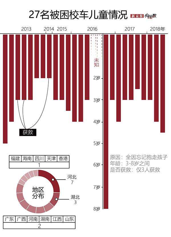 而校车,更准确地说是幼儿园的校车成为此类事件中夺走孩子生命的最大杀手。在统计的26起(27名儿童)被困校车事件中,全部都因工作人员忘记将孩子带走,绝大部分孩子是6岁以下的学龄儿童,24名儿童不幸死亡,占到统计的近五年此类事件死亡人数一半以上。