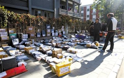 昨日,中国传媒大学西门外,圆通快递的快件摆放在地上。据现场工作人员称,“双11”过后,昨日的快件数量较平时增加了近一倍。新京报记者 黄月 摄
