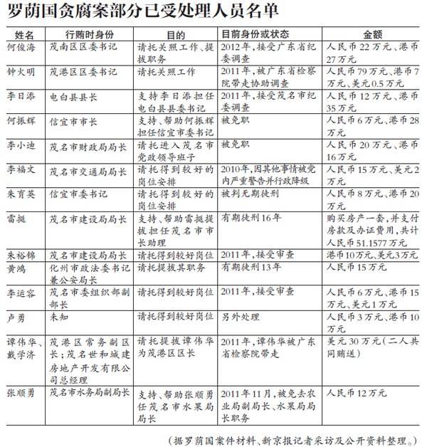 新京报记者查证,向罗荫国行贿的44名官员中,只有3人进入司法程序,目前受到审判。这三人分别为:茂名市原人大常委会副主任朱育英;茂名原市长助理雷挺;化州市原政法委书记兼公安局长黄鸿。