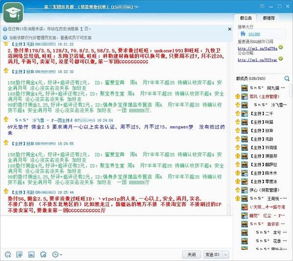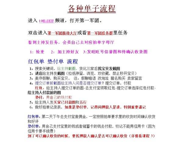 根据介绍,浏览单,就是去客户商家的淘宝店里浏览,增加浏览量;红包单,就是商家把钱做成一个红包,然后把红包的卡号和密码发给军团里的会员,由会员使用该红包进行商品的购买,增加销量;而代付单和垫付单,则跟红包单大同小异,不同的只是支付的方式,有的需要商家代付,有的由会员进行垫付。