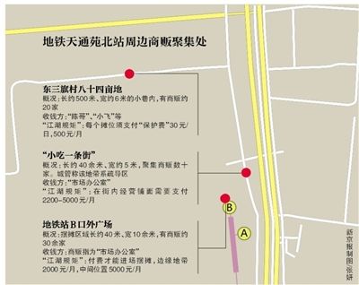 地铁天通苑北站周边摊贩云集乱象丛生:不明身份人员收“保护费”,站外广场交钱可摆摊;管理方称治理遇困境