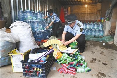6月初,丰台卢沟桥北路附近,执法人员在一假桶装水窝点内,查获大量瓶盖和假防伪码。A08-09版摄影/新京报记者 尹亚飞