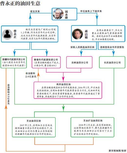 新京报记者调查获悉,2005年上半年,曹永正为涉足油田开发业务请周永康帮忙,周永康安排曹永正与时任中国石油天然气集团公司副总经理蒋洁敏相识,并在曹永正的多次请托中给予关照过问。蒋洁敏违规为曹永正在吉林油田、长庆油田等“区块合作”项目上进行审批,使曹永正的空壳公司得以大肆攫取巨额利润,国家利益遭受重大损失。