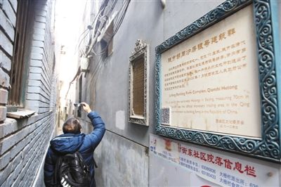 在胡同北侧的建筑墙壁上,挂着白底金字的一块牌子,写着“钱市胡同炉房银号建筑群”,据介绍,这条胡同在清代为管办银钱交易场所,民国以后改建为银号铺房。2009年7月,被列为西城区区级文物保护单位。