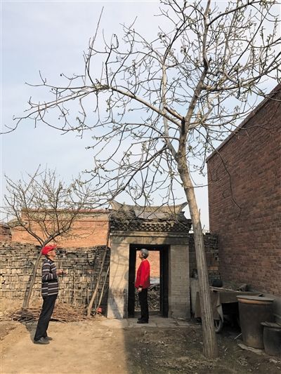 院里有桃树、杏树、葡萄、石榴树。还有一棵20年的核桃树,高5米,树干有盘口那么粗。袁玉山说,别看这树现在光秃秃的,到7月会结满核桃,能有200斤,“不知道还有没有机会吃到今年的核桃。”