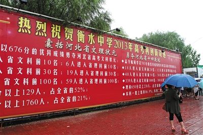 2013年7月13日,河北衡水中学校门西侧一块巨大的展板显示着当年的高考成绩。 图/视觉中国