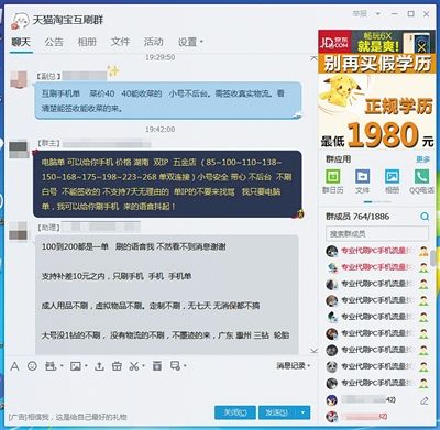记者随机进入其中一个“天猫淘宝互刷群”,群内有1886人,显示在线有700多人。大家在群里并不闲聊,只发送自己的互刷要求。放单的信息几乎24小时刷屏。