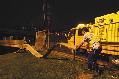 昨日,丰台区岳各庄桥,排水集团抢险工作人员在布置抽水管。新京报记者 侯少卿 摄