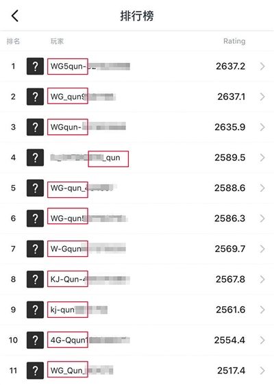 11月7日,官方的游戏战绩排行榜上,排名靠前的多是卖外挂(WG)的QQ群。 网页截图