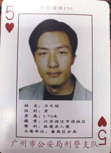 2012年4月,广州警方以扑克牌编号形式,发布一连串通缉令,向全社会征集破案线索,被称为“扑克牌通缉令”。全部54名在逃人员均身负要案,且多年没有线索。其中,力天佑位列“红桃5”。