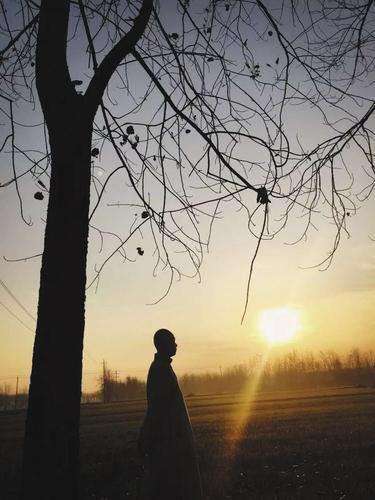 力天佑在微信朋友圈发布的照片,风格统一:夕阳西下,身穿僧袍的他,站在杨树林里,或是远眺,或是俯身,显得恬淡而有禅意。
