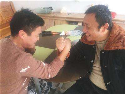 在旁人打趣下,周继坤和27岁的儿子掰手腕比力气,尽享家庭之乐。受访者供图
