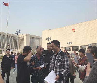 4月11日下午,安徽省高院门前,周在春(左二)手拿无罪判决书号啕大哭。