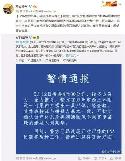 5月12日,郑州市公安局官方微博“平安郑州”发布称,“空姐顺风车遇害案”嫌疑人刘某华尸体已被打捞。案件至此告破。