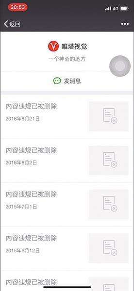 “刘某昀的公众号叫做‘唯塔视觉’,”陈姝和杨珞描述,这个公众号是刘某昀主要发布照片的渠道。4月17日,新京报记者查看“唯塔视觉”微信公众号后发现,公众号中的内容已经被停止访问,公众号已经被腾讯封号。查询封号原因——遭到大量用户投诉,账号出现违规行为;发布庸俗挑逗性内容、散布淫秽、色情内容等。