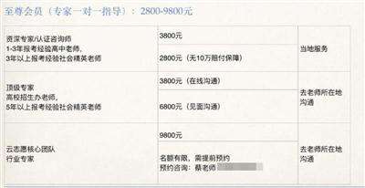 一家名为云志愿的高考志愿填报辅导网站,至尊会员(专家一对一填志愿)标价5800到50000元。云志愿客服告诉记者,专家一对一的价格实际没有网站上标得那么高,专家分为资深专家、顶级专家、云志愿核心团队三类,价格从2800元到9800元。“和专家面谈需要预约,一般为一次。”云志愿的客服称。