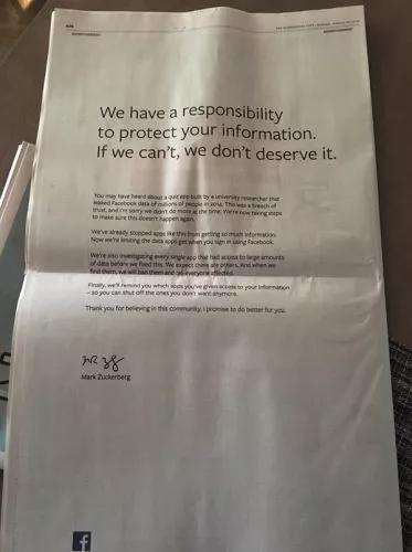 有意思的是,Facebook创始人马克·扎克伯格刚刚在9家报纸上为“信任的违背”登报道歉。“这是对信任的违背,我很抱歉我们没有在当时做得更多。”