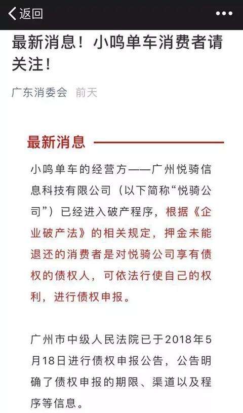 昨天(5月19日),广东消委会官方微信发布消息称,小鸣单车的经营方广州悦骑信息科技有限公司已正式进入破产清算程序,据《企业破产法》的相关规定,押金未能退还的消费者是对悦骑公司享有债权的债权人,可依法行使自己的权利,进行债权申报。
