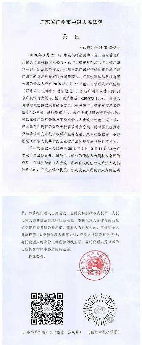 此前,广州市中级人民法院已于5月18日发布债权申报公告,称已正式受理广州悦骑信息科技有限公司(系“小鸣单车”经营者)破产清算一案,并公布债权申报的途径、期限及程序等信息。
