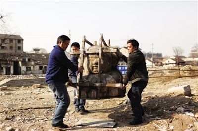 拆迁改建中的工地上,惠山泥人厂的工作人员正在搬运一个大型“阿福”模具。