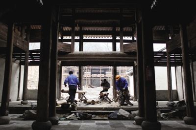 惠山古镇一处正在整修的祠堂。惠山已发现118处祠堂建筑和遗迹,汇集了自唐代至民国时期的80个姓氏,180位历史名人。