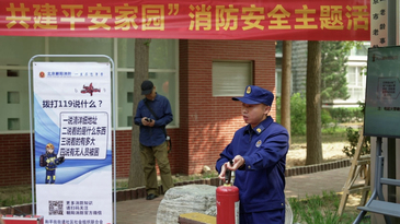 北京朝阳消防安全演练活动进社区,消防员展示救援器材使用方法