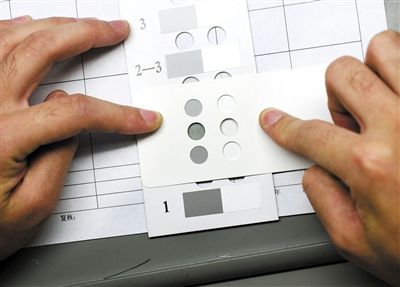 图1:检测人员用“灰色样卡”比对样本颜色级别。