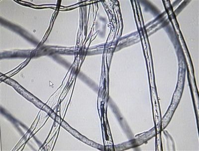 实验过程:检测人员将标注为100%棉的一件“时尚贝贝”牌圆领短袖童装剪开,撑开,扯出纤维,发现里面有一根线非常细小,另一根稍微粗一些。取下两根线分别放在玻璃片上拨散开,滴上石蜡,制样放到电子显微镜下观察。