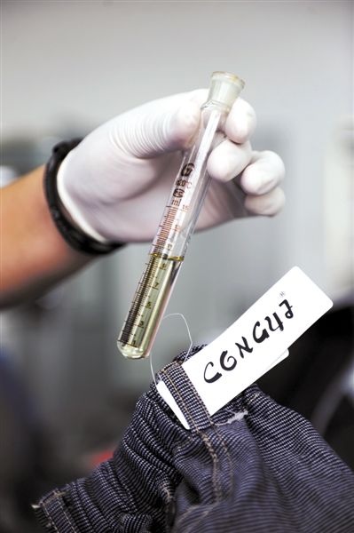 实验过程:检测人员将一款“聪一”牌裤子样品剪下一小段,称量2克放入磨口玻璃瓶中,加实验用的蒸馏水100ml,然后对剪碎的衣服样本进行萃取(放到振荡器中1个小时),加入乙酰丙酮,进行显色反应。半小时后,试管中液体呈现出淡黄色。