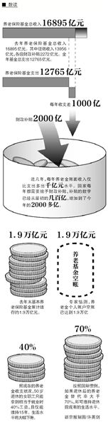 人社部统计年报显示,这几年,每年养老金的账面收入仅比支出多出千亿元的水平。
