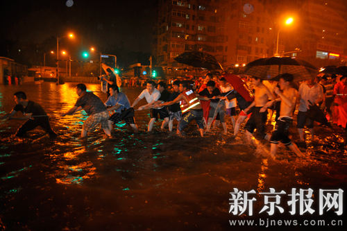 昨晚,暴雨使广渠门桥下一片汪洋,五辆车搁浅水中,救援人员赶来拖拽水中车辆。