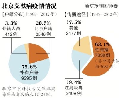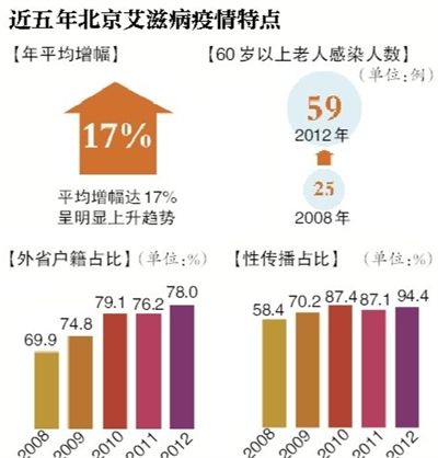 北京市卫生局疾控处负责人表示,尤其值得注意的是,2008年至2012年北京市报告的艾滋病病毒感染者和病人中,男男同性性行为者的比例上升尤为明显,已从2008年的35.9%上升到2012年的69.5%,明显高于异性传播所占的比例。