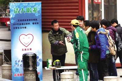 昨日,西安鼓楼广场附近,艾滋感染者秦跃杰竖着“请人喝茶”的牌子要请路人喝茶。当日,一场“艾滋病感染者请你喝茶”的活动举行。图/CFP