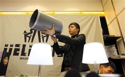 来自江苏的李祖生销售的魔术道具几乎全部是自己研发的产品,其中最受欢迎的是“可乐分身”道具。在他手中,一瓶完整的可乐瓶中间可以插入一块钢板,而钢板抽出以后,瓶子仍然可以保持完好无损。来自北京的李想也是一个小魔术师,他现场表演了“纸币漂浮”、“大刀割腕”等,引发现场一阵阵欢呼。