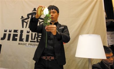 一位魔术师在介绍道具“灯光玫瑰”。