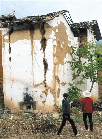 4月17日,云南大理洱源震区炼铁乡长邑村震裂的烤烟房。