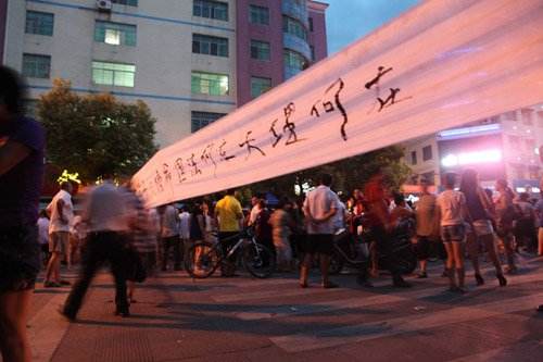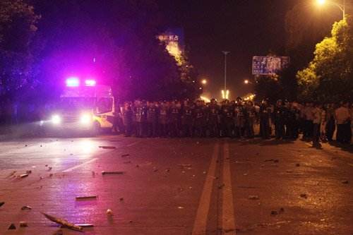 图为当晚9点开始,警方多次试图抢尸,被围观群众用石头、矿泉水、西瓜打退,现场一度混乱。 东方IC