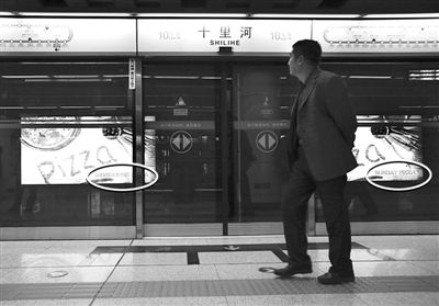 11月17日,10号线十里河站,图案相同的两块广告牌,但分别写着小猫鼬比萨和星期日比萨(圆圈标示处)。而这些物品其实并不存在。 新京报记者 黄月 摄