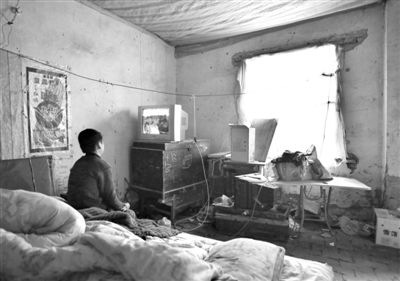 房子是用自家桐树做的椽木和檩木,窗上钉着挡风的透明塑料哗啦啦地鼓动,墙上、屋顶吊着红蓝白的彩条塑料布,边角处是化肥袋子补丁。两个歪歪斜斜的衣柜,最值钱的是电视机。